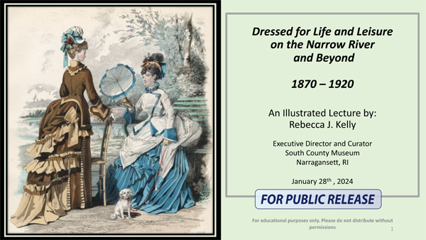 Rebecca Kelly, Deputy Director and Curator at the South County Museum, discussed nineteenth-century clothing from the museum’s collection highlighting both high fashion and leisure ware, as in what does the fashionable Narragansett visitor wear to the beach in 1900.